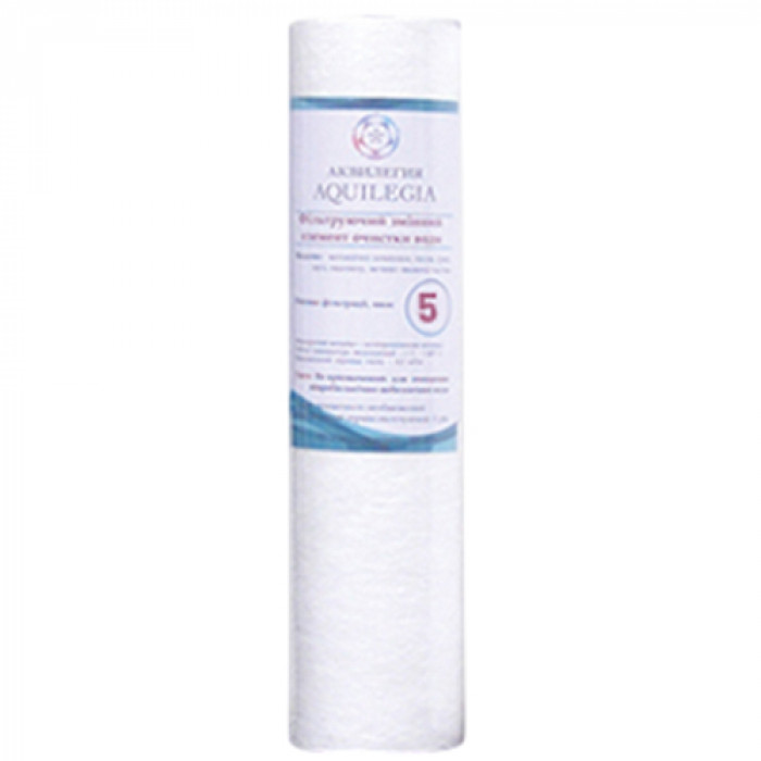 Aquilegia PP1025-5 - картридж із поліпропіленового волокна для попереднього механічного очищення холодної води. Затримує пісок, іржу та інші зважені домішки. Ступінь очищення: 5 мкм.
