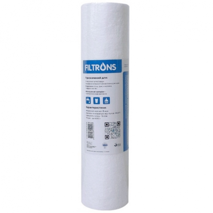Filtrons FLP10SL5 - картридж із поліпропіленового волокна для попереднього механічного очищення холодної води. Затримує пісок, іржу та інші зважені домішки. Ступінь очищення: 5 мкм.