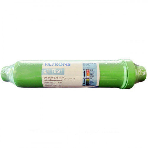 Filtrons pH Filter - картридж перетворює воду, що пройшла зворотний осмос, в pH-воду. Фільтруючий елемент забезпечує воді збалансоване значення pH в діапазоні 8.00-9.50 (роблячи її лужною).