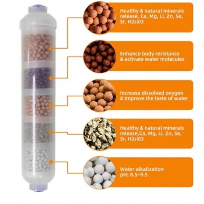 - Насичує воду корисними мінералами: кальцій, магній, літій, цинк, селен, стронцій, кремнієва кислота