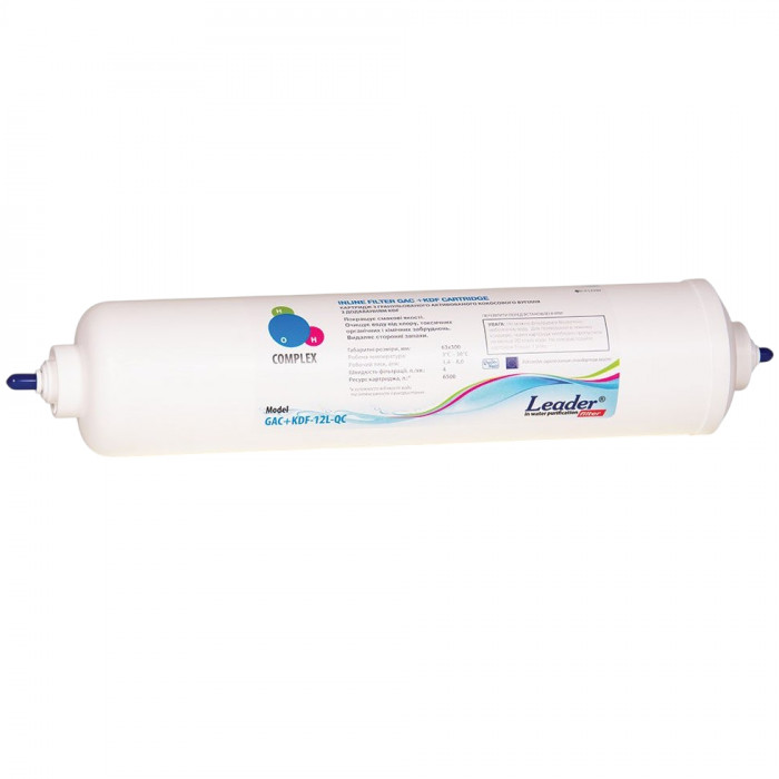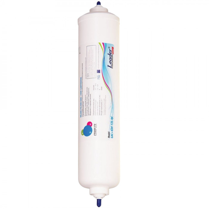 Leader in-line GAC+KDF-12L-QC - постфільтр для фінішного доочищення води в системі зворотного осмосу. Містить у складі гранульоване активоване кокосове вугілля з додаванням KDF.