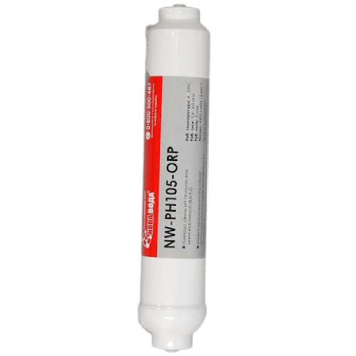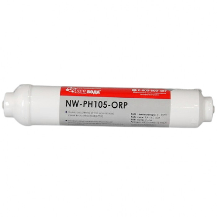 Нова Вода NW-PH105 - це лінійний картридж, який має у своєму складі мінеральний композит. Використовується для корекції рівня pH та окисно-відновного потенціалу води. Коректор робить воду більш лужною та антиоксидантною.