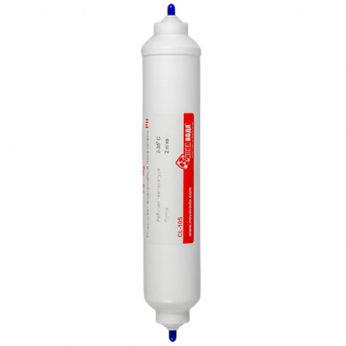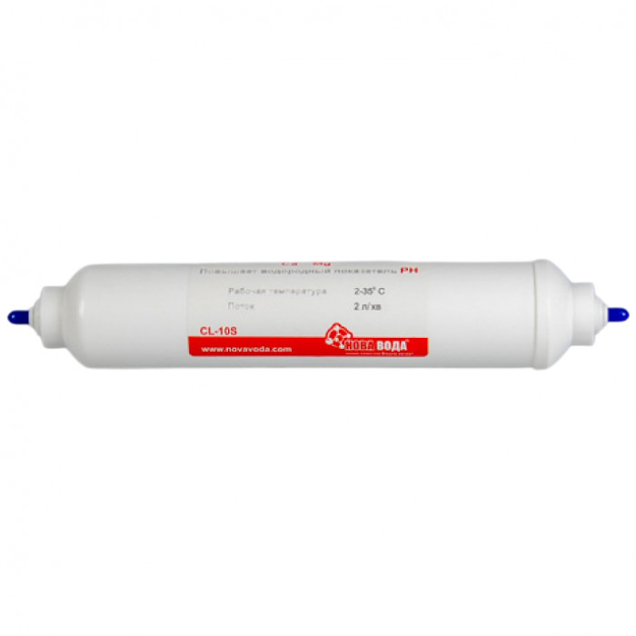 Нова Вода CL10-S - мінералізатор фільтра зворотного осмосу для покращення смаку води. Насичує воду корисними мікроелементами: калій, натрій, кальцій, магній. Підвищує водневий показник pH. Наявність активованого вугілля проводить додаткову постфільтрацію, покращуючи запах води.