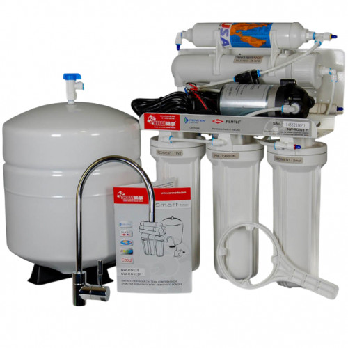 Новая Вода NW-RO525P Smart - система с высококачественными комплектуючищи для фильтрации питьевой воды, приготовления пищи и напитков. Обеспечивет комплексную очистку водопроводной воды от разных примесей: механические и органические загрязнения, хлор, соли жесткости, тяжелые металлы, нефтепродукты и другие вредные соединения.